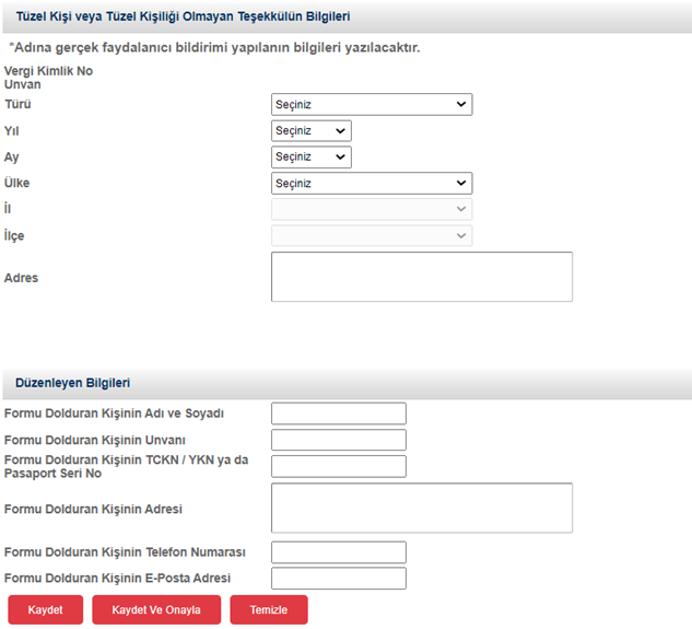 Kurumlar vergisi mükellefleri dışında kalan diğer mükellefler ile diğer kişiler gerçek faydalanıcı bilgisini her yılın Ağustos ayı sonuna kadar Gelir İdaresi Başkanlığına bir form ile elektronik ortamda bildirmek zorundadır.