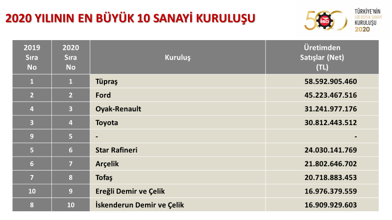 İSO 500’de 2020 yılında üretimden satışlara göre en büyük kuruluş geçen yıl olduğu gibi 58 milyar 593 milyon TL ile “TÜPRAŞ-Türkiye Petrol Rafinerileri A.Ş.” oldu. 45 milyar 223 milyon TL ile ikincilik sırasında “Ford Otomotiv Sanayi A.Ş.” yer alırken 31 milyar 242 milyon TL’lik üretimden satışlarıyla “Oyak-Renault Otomobil Fabrikaları A.Ş.” üçüncü oldu.