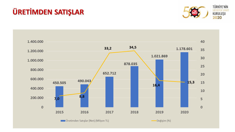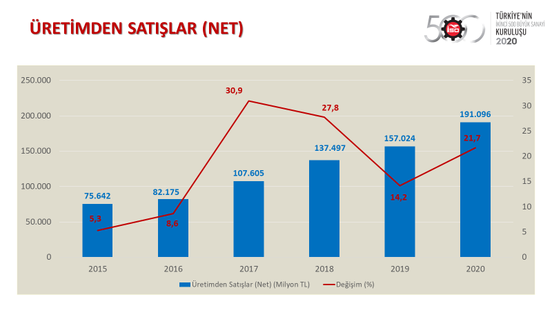 İstanbul Sanayi Odası tarafından paylaşılan bilgilere göre İSO 500’ün 2020 yılındaki üretim 1 trilyon 22 milyar TL’den 1 trilyon 179 milyar TL’ye yükselerek, yüzde 15,3 oranında artış gösterdi. 2018’deki yüzde 34,5 ve 2019’daki yüzde 16,4’lük artışlar ile karşılaştırıldığında üretimden satışlarda büyüme performansının pandeminin etkisiyle yavaşladığı gözlemlendi.