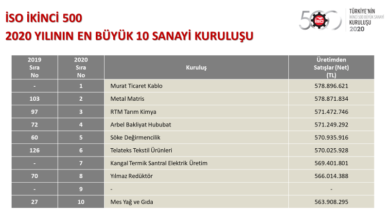 İSO İkinci 500’de ilk sırayı 578,9 milyon liralık üretimden net satışlar tutarı ile “Murat Ticaret Kablo Sanayi A.Ş.” aldı. İkinci sırada ise yine 578,9 milyon liralık üretimden net satışları ile “Metal Matris San. ve Tic. A.Ş.” yer aldı. Üçüncü sırada yer alan kuruluş ise 571,5 milyon lira ile “RTM Tarım Kimya San. ve Tic. A.Ş.” oldu.